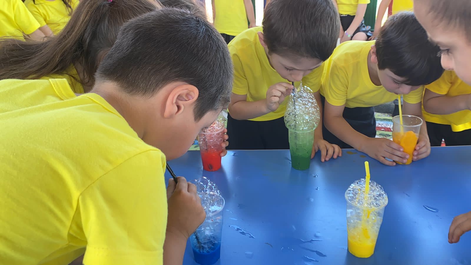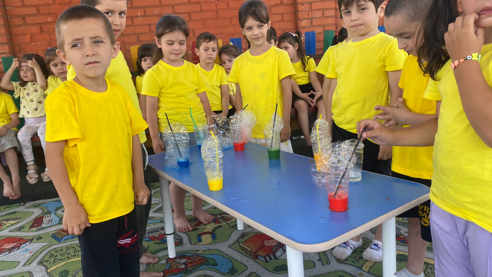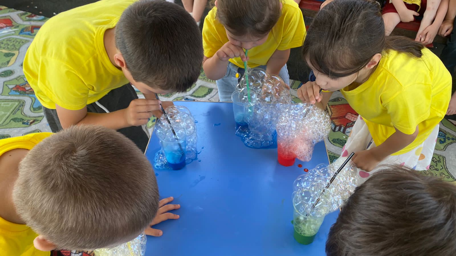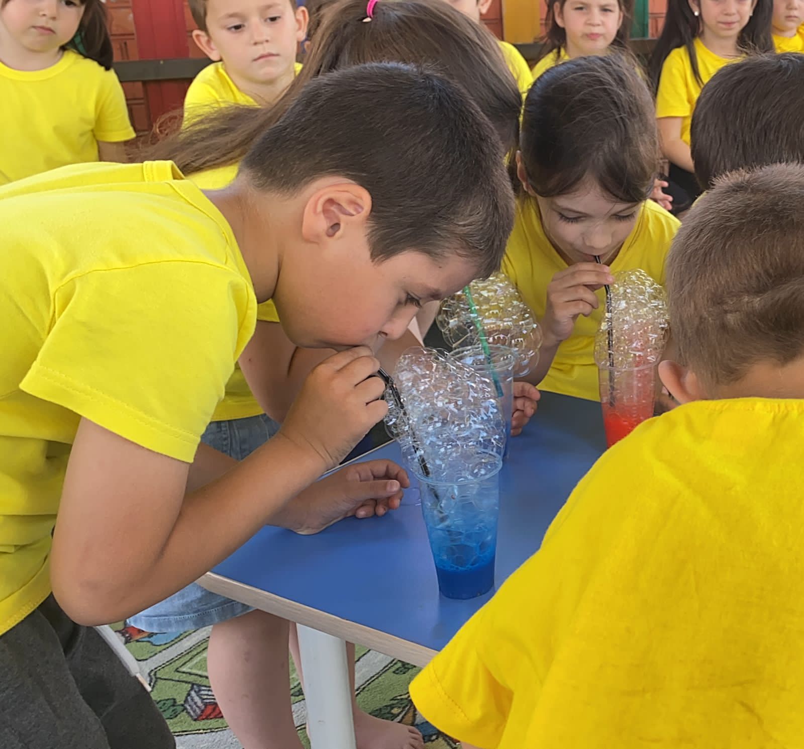 Ребята с восторгом наблюдали за разноцветными пузырьками, за их волшебным превращением, проводили опыты, показывали фокусы, смеялись, прыгали от радости, визжали от восторга, хлопали в ладоши.