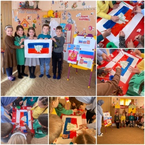 Накануне дети просмотрели презентацию «Государственные символы страны», посмотрели картинки с изображением главных символов России, была проведена познавательная беседа «Символика России».